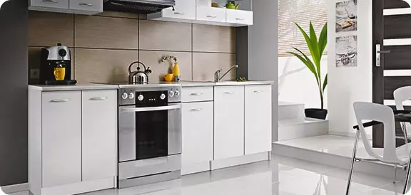 - Для кухни. Мы предоставляем возможность самостоятельно «собрать» кухню по модулям, что существенно упрощает подбор мебели. В большом количестве представлены шкафы, столешницы, а также столы, стулья, табуретки, мойки, смесители, стеновые панели (фартуки). Есть и готовые гарнитуры всех существующих типов (угловые, прямые, малогабаритные, для дачи и для офиса). Вся мебель отличается устойчивостью к загрязнениям, спокойно переносит резкие перепады температур, при необходимости легко очищается.