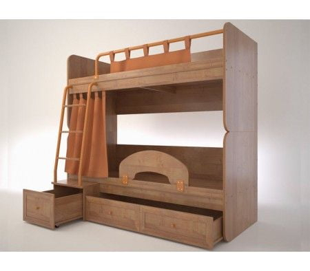 · Комплекс состоит из двухъярусной кровати и двух вместительных выкатных ящиков. · Комплект «НЕМО» можно поставить как две отдельные кровати. · Верхний ярус оборудован удобным и безопасным металлическим бортиком. · Укромное местечко обеспечивает комплект занавесок. · Комплект можно дополнять изделиями из модульной системы «ОЛИМП». · Надежная, безопасная лестница с удобными ступеньками позволит ребенку легко забраться в кровать. · Расположение лестницы (справа или слева) можно выбрать при сборке. · Скругления и радиусные скосы обеспечат безопасность Вашему ребенку.