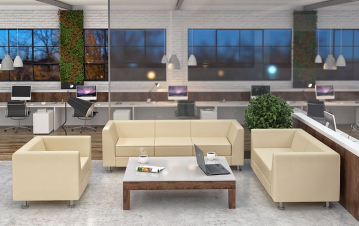 Изделия облицовываются экокожей. Диваны и кресло собраны на высокопрочном хромированном каркасе. Готовые изделия упаковываются в пленку и гофрокартон.