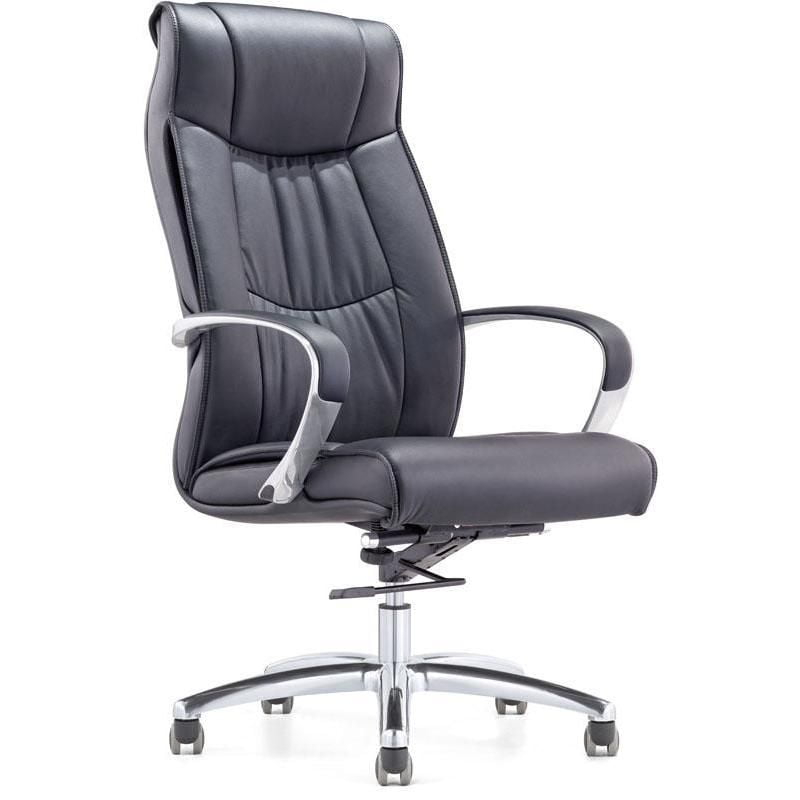 Лицевые части кресла для руководителя декорированы натуральной кожей черного цвета. Боковины, задняя часть сиденья и спинки выполнены из высококачественной искусственной кожи с учетом фактуры кресла. Крестовина и подлокотники - из хромированного металла. На подлокотниках мягкие накладки. Механизм качания позволяет осуществлять свободное качание с фиксацией в рабочем положении. Регулировка по высоте (газлифт).