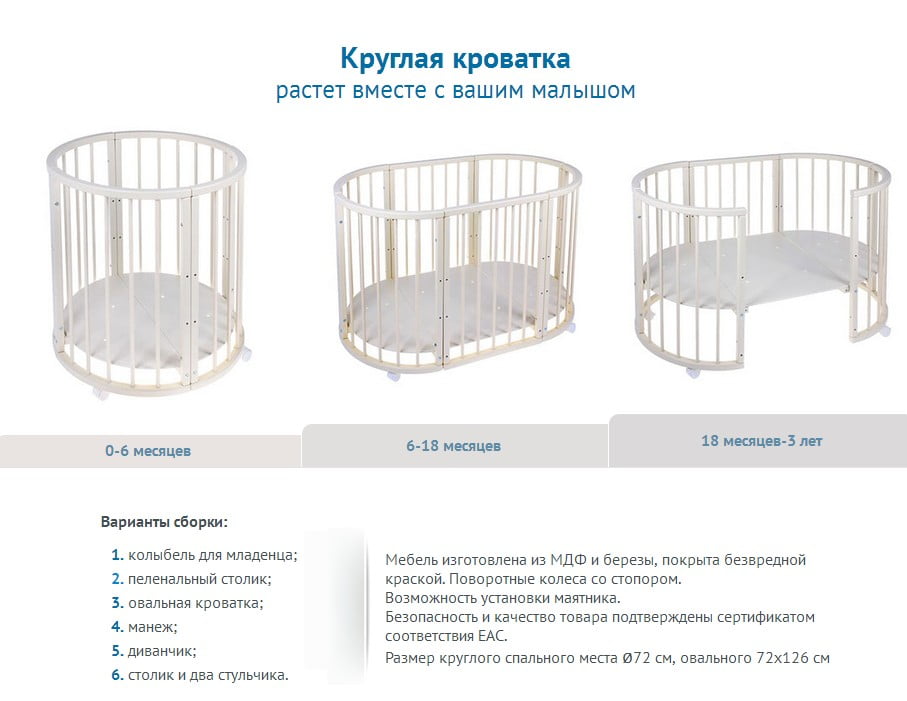 Особенности Кроватка-трансформер имеет 6 вариантов трансформации: круглая кроватка (колыбель) и пеленальный столик; овальная кроватка; диванчик; манеж; столик и два стульчика.