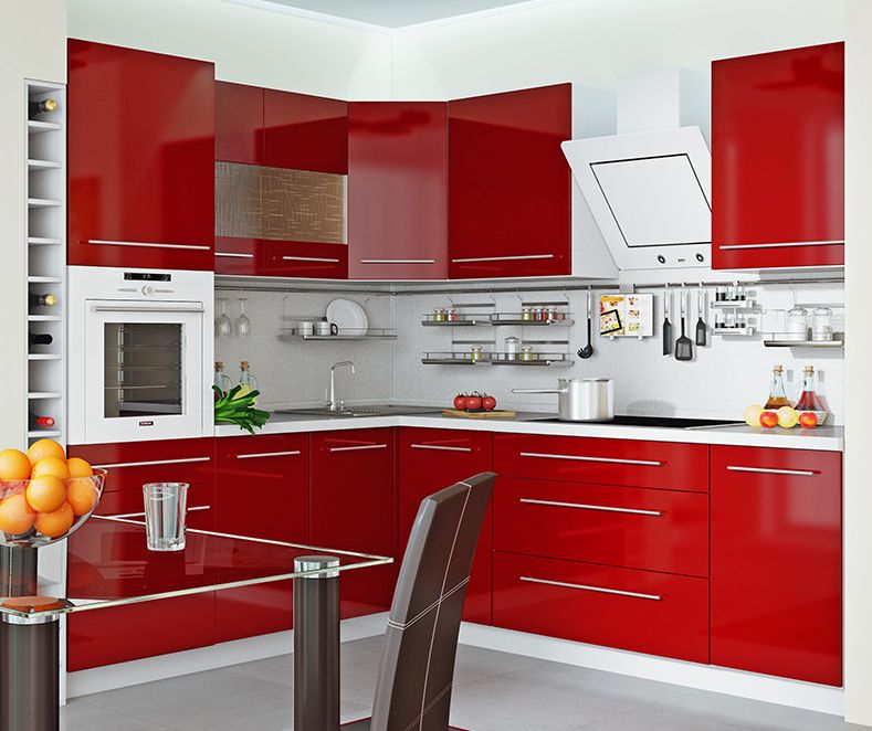 Угловой кухонный гарнитур «Ассорти» Вишня оформлен в эффектном сочетании белоснежных корпусных элементов с насыщенно-яркими фасадами удобных функциональных шкафов, изящными металлическими ручками эргономичной формы и витринными вставками навесных полок.