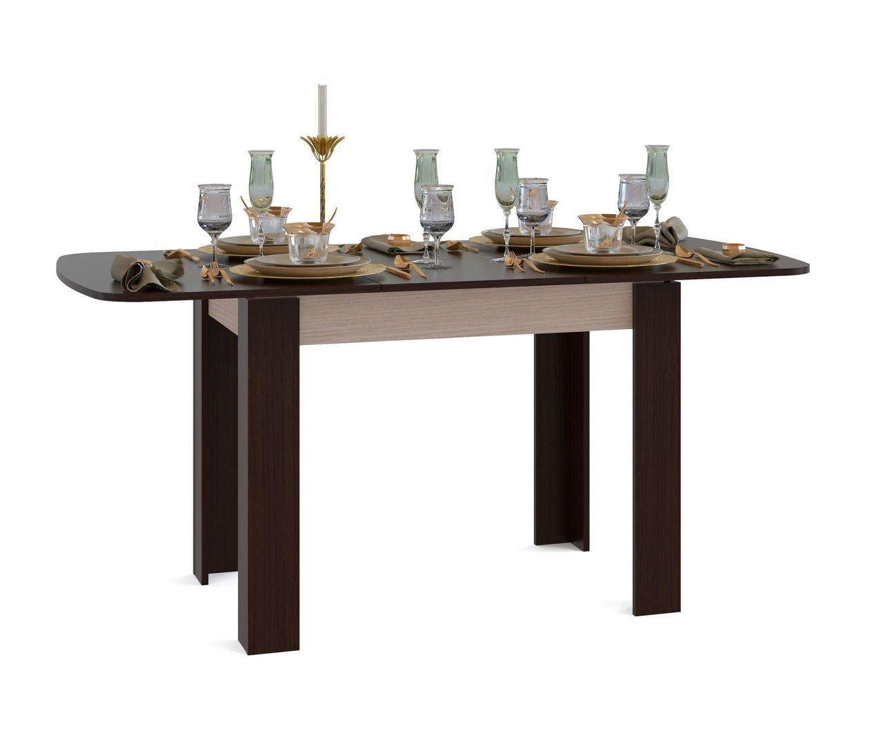 Большой обеденный стол в стильных контрастных оттенках. Угловое оформление ножек делает стол устойчивым и надежным в использовании, а закругленные края столешницы снижают травмоопасность. Модель современна и лаконична, она будет гармоничным дополнением практически любого интерьера кухни. Стол оборудован раскладным механизмом «бабочка», который позволяет увеличит размеры столешницы до 1646 мм за счет дополнительной вставки размером 446 мм. В сложенном состоянии вставка храниться внутри стола. Изделие изготавливается из ЛДСП толщиной 16 мм. Столешница обработана кромкой ПВХ толщиной 2 мм, остальные детали в кромке ПВХ 0,4 мм. Рекомендуем сохранить инструкцию по сборке (паспорт изделия) до истечения гарантийного срока.