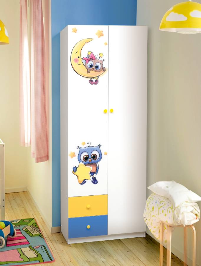 Шкаф 2-х дверный комбинированный с ящиками и фотопечатью Совята 2.1 Белый/Желтый/Синий_204928