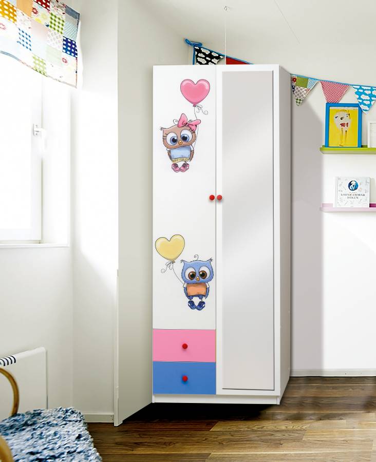 Шкаф 2-х дверный комбинированный с ящиками, зеркалом и фотопечатью Совята 2.2 Белый/Ярко-розовый/Синий_204942