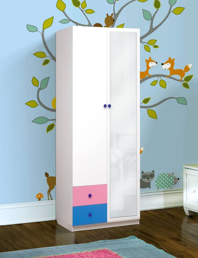 Шкаф 2-х дверный с ящиками и зеркалом Радуга Белый/Ярко-розовый/Синий_205089