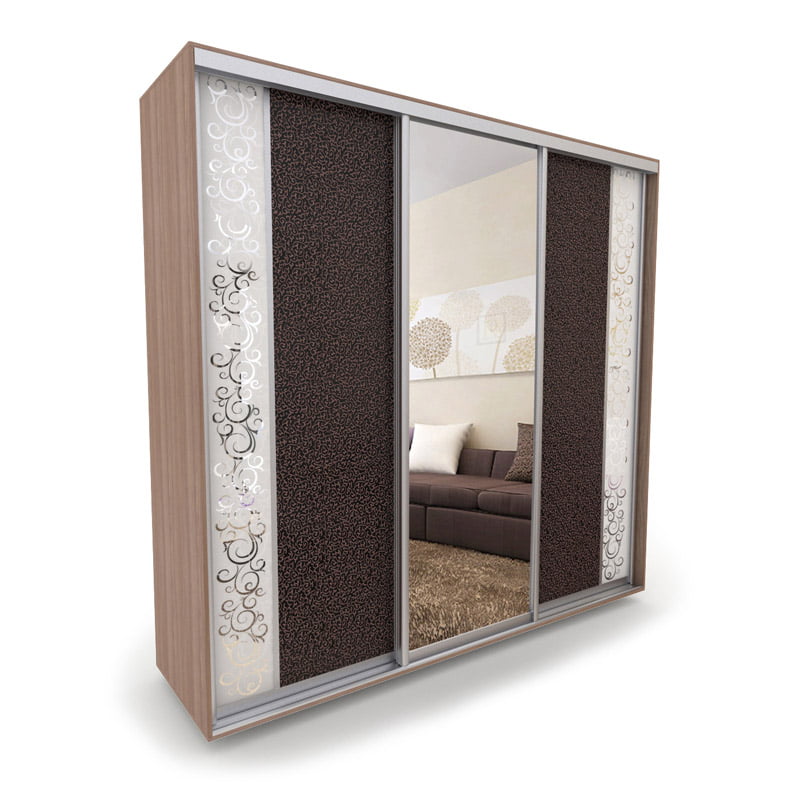 Двери купе выполнены в комбинации эко-кожи "Лоза" и зеркальной вставки с пескоструйной обработкой. Рисунок обработки "спирали", фон матовый, рисунок - зеркальный. Для темных тонов ЛДСП корпуса используется темный цвет эко-кожи, для светлых тонов – светлая. Высококачественный толстостенный алюминиевый профиль цвета хром матовый.