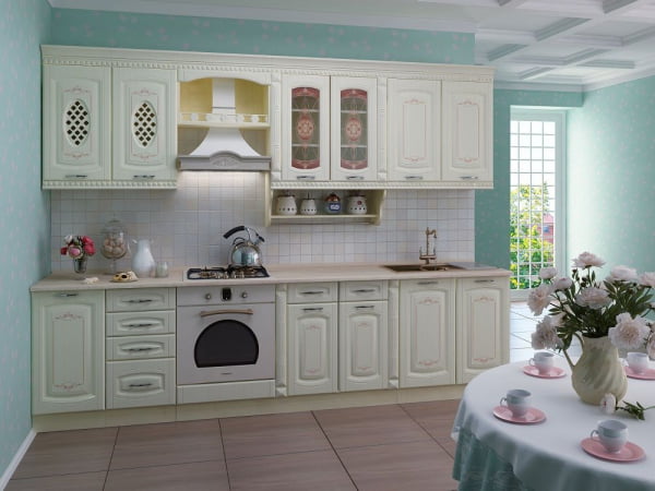 Корпуса "Клен танзай", фасады МДФ "Беленый дуб", постформа "Тростник"
