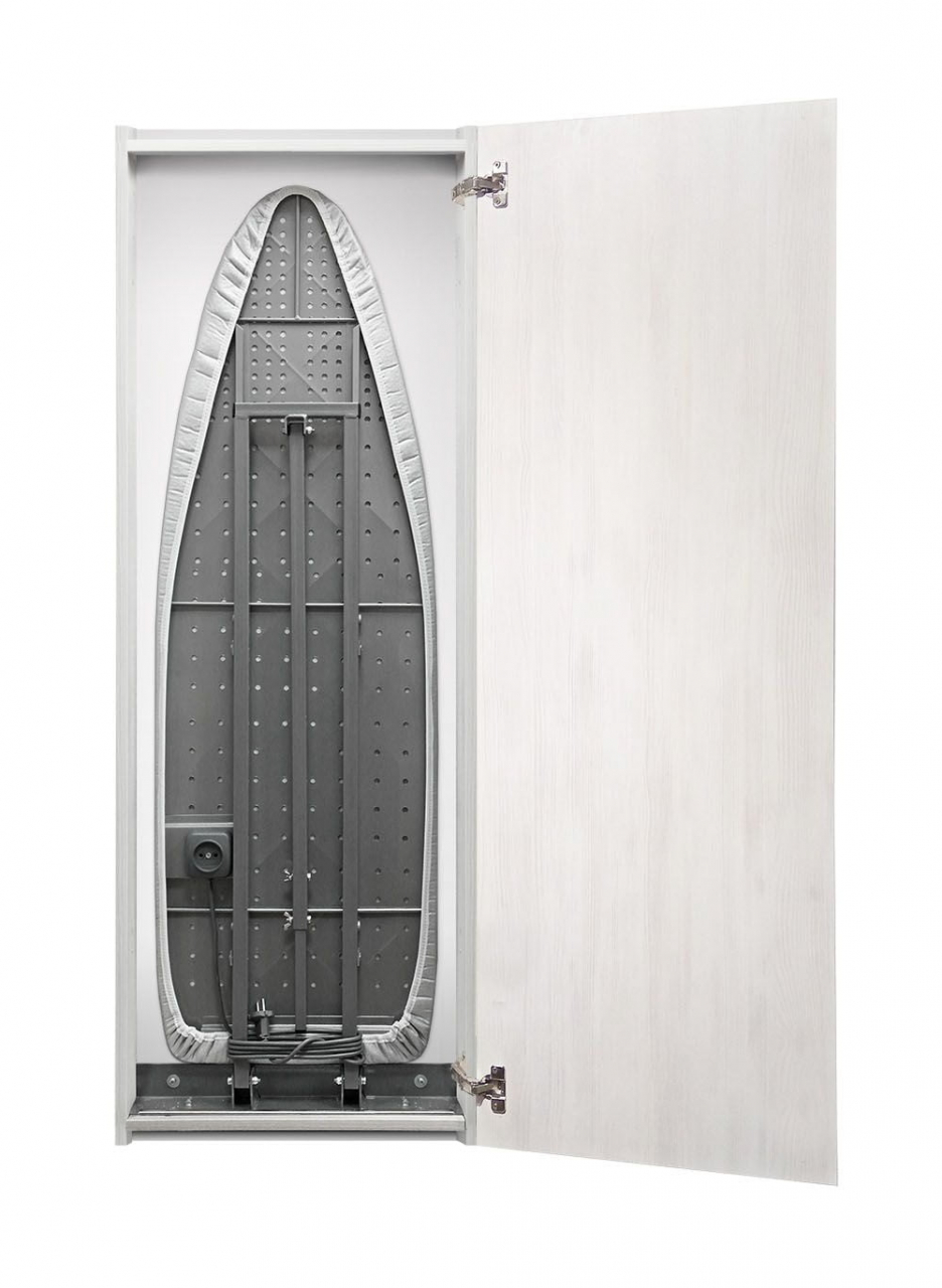 Широкая гладильная доска из перфорированного металла крепится к стене на мощном кронштейне. С другой стороны устойчивость придает нога, опирающаяся на пол под тупым углом. Благодаря регулировке опорной ноги доска может быть размещена на высоте от 75 до 95см от пола. Поднятая доска фиксируется к стене небольшим магнитом.