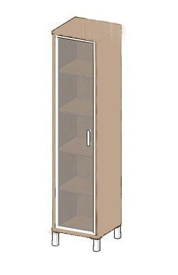 Каркасы шкафов выполнены из ЛДСП толщиной 25мм., кромка ПВХ т. 2мм.  Задняя стенка из ХДФ т.4мм разрезная в паз. Внутренние полки из ЛДСП 18мм., кромка ПВХ т.0,8 мм. ЛДСП т 25мм., кромка ПВХ т. 2 с фасадной стороны, кромка ПВХ т. 0,8 с трех сторон. В упаковке один горизонтальный щит, который можно устанавливать вверху или внизу изделия. Опора регулируемая, цвет алюминий. Стеклянная дверь в алюминиевой рамке, стекло - тонированное пленкой, бронза. Ручка скоба, цвет алюминий. Двери вкладные.