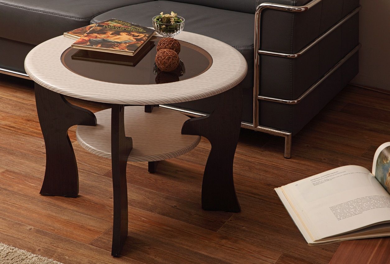 Небольшой красивый журнальный столик на необычных изогнутых ножках-опорах Маджеста-6 со столешницей круглой формы идеально подойдет для гостиной любого интерьера. В столешнице столика имеется стеклянная вставка, под столешницей - небольшая полочка для журналов, книг или разных мелочей.