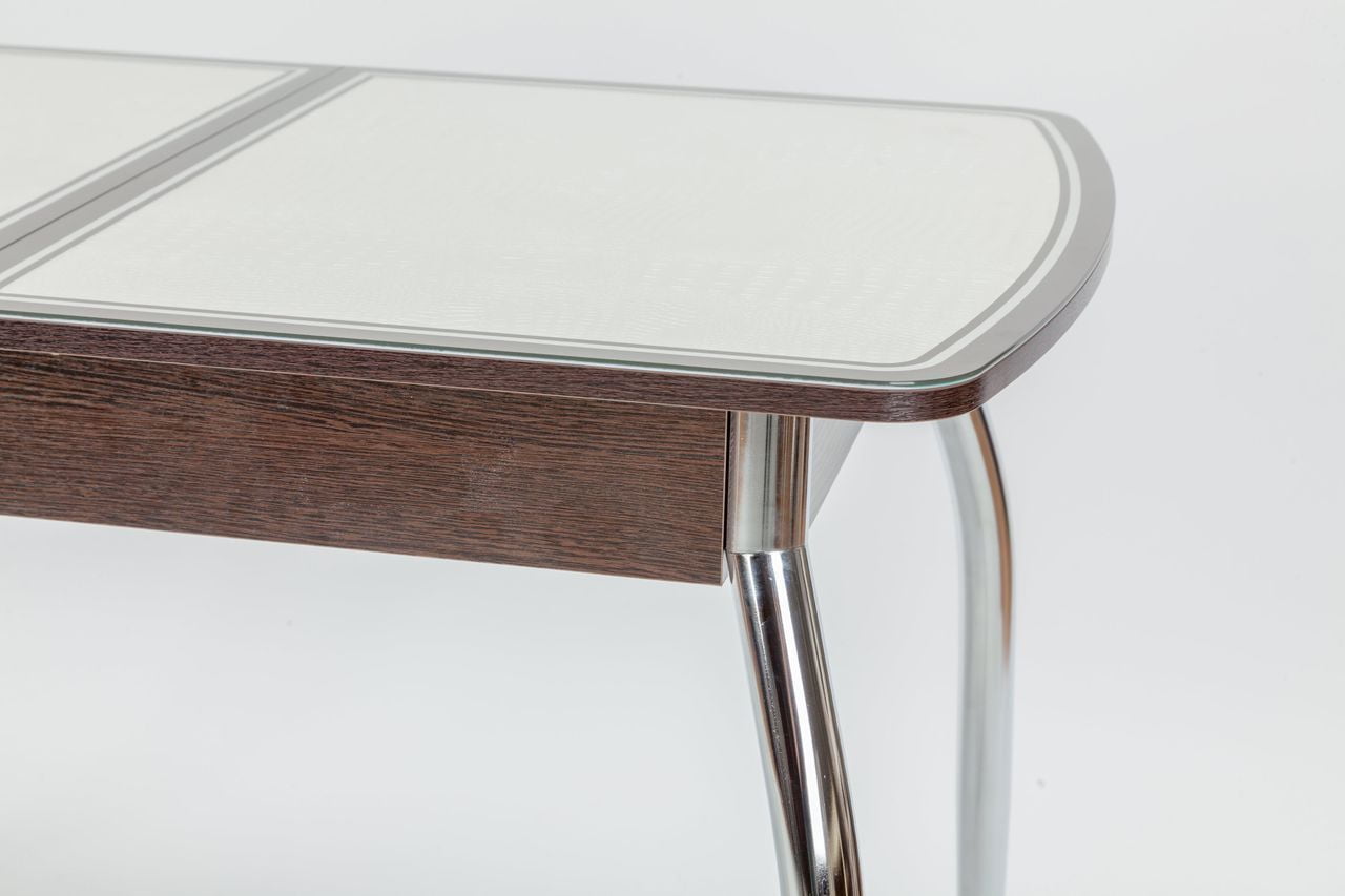 Необычное сочетание ЛДСП, кожзама и закаленного стекла в исполнение столешницы придаст шарм вашей кухне. Механизм раскладки- синхронно -раздвижной (бабочка). В разложенном виде стеклянные половинки столешницы разделяет вставка из ЛДСП.