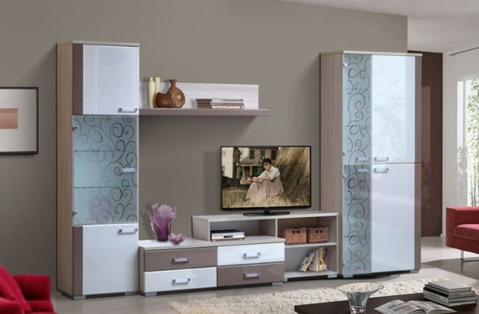 Гостиная Гармония-2 — изящная и очень нежная, за счет сочетая двух теплых оттенков дерева, дополненных стеклянными элементами с орнаментом!  Гостиная изготовлена из высококачественной и высокоэкологичной плиты европейского класса Е1, фасад стекло с орнаментом.