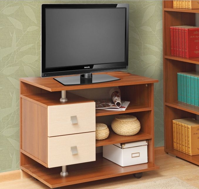 Стильная и компактная тумба на колесиках, оборудованная четырьмя открытыми нишами и двумя вместительными выдвижными ящиками - мобильный и функциональный «постамент» для Вашего домашнего кинотеатра!