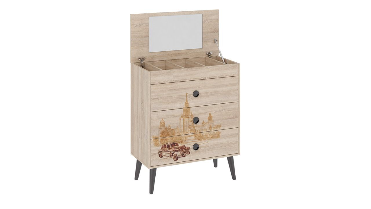 Дизайн данной модели навеян стилем ретро, уносящим нас в 60-е, 70-е годы прошлого столетия. Изображения сооружений из авторских рисунков известных российских художников прошлых лет. Уникальные дизайнерские ножки изделий изготовлены из твердолиственных пород дерева, идеально спроектированный угол наклона которых, придает не только высокую эргономичность данным моделям, но и обеспечивает невероятную устойчивость. Оригинальные ручки, имеющие удобную форму с углублением, позволяют с легкостью открывать двери и ящики.